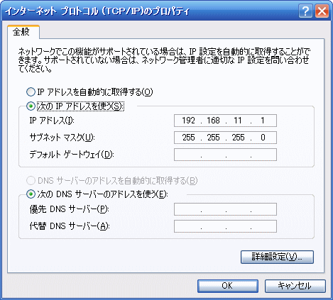 ・パソコンのIPアドレスを192.168.11.1に設定する。
