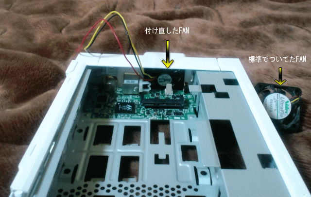 • ついでなので、以前から、気になっていた五月蝿いだけで冷却効果の低い背面FANを静で冷却効果のある FANに交換する。 背面内部のネジ4本外して、FANは、簡単に外れました。何故か?部屋に転がっている清音FANに交換 (以前、ノートパソコンのファンを交換しようと購入したが、グリスさすだけで静かになったので交換せずに 転がっていた。。忘れてた)