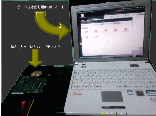 家には、LINUXマシンが何台かありますが、無ければ、DVD起動のLINUXを用意する必要があります。 普段は、埃を被ってるいる、Ubuntuを入れたノートパソコンを起動します。 HDDをUSBで繋げるアダプタ(こんなやつ) を使って、パソコンに接続します。 この時、物理的に認識しない場合は、諦めて下さい。